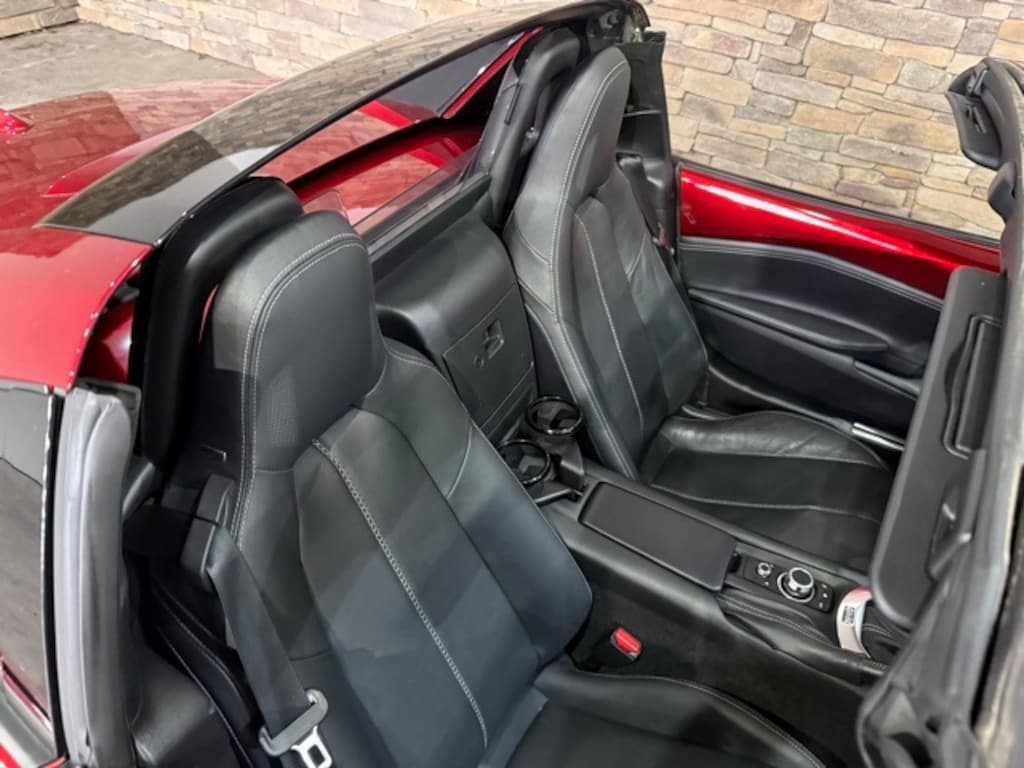 3-Level Heated Front Bucket Seats, 4-Wheel Disc Brakes, 9 Speakers, ABS brakes, Air Conditioning, Alloy wheels, AM/FM radio: SiriusXM, AppLink/Apple CarPlay and Android Auto, Auto High-beam Headlights, Auto-dimming door mirrors, Auto-dimming Rear-View mirror, Automatic temperature control, Brake assist, Bumpers: body-color, Convertible HardTop, Convertible roof lining, Convertible roof wind blocker, Delay-off headlights, Driver vanity mirror, Dual front impact airbags, Dual front side impact airbags, Electronic Stability Control, Emergency communication system: MAZDA CONNECT, Exterior Parking Camera Rear, Four wheel independent suspension, Front anti-roll bar, Front Bucket Seats, Front Center Armrest, Fully automatic headlights, Garage door transmitter: HomeLink, Glass rear window, Heated door mirrors, Heated front seats, Illuminated entry, Leather Shift Knob, Leather Upholstery w/Light Gray Stitching, Low tire pressure warning, MAZDA CONNECT Infotainment System, Navigation System, Occupant sensing airbag, Outside temperature display, Panic alarm, Passenger vanity mirror, Power convertible roof, Power door mirrors, Power steering, Power windows, Radio data system, Radio: Bose Audio System w/AudioPilot, Rain sensing wipers, Rear anti-roll bar, Rear window defroster, Remote keyless entry, Soul Red Crystal Paint Charge, Speed control, Speed-sensing steering, Sport steering wheel, Steering wheel mounted audio controls, Tachometer, Telescoping steering wheel, Tilt steering wheel, Traction control, Trip computer, Variably intermittent wipers, and Wheels: 17" x 7" Dark Silver Aluminum Alloy.